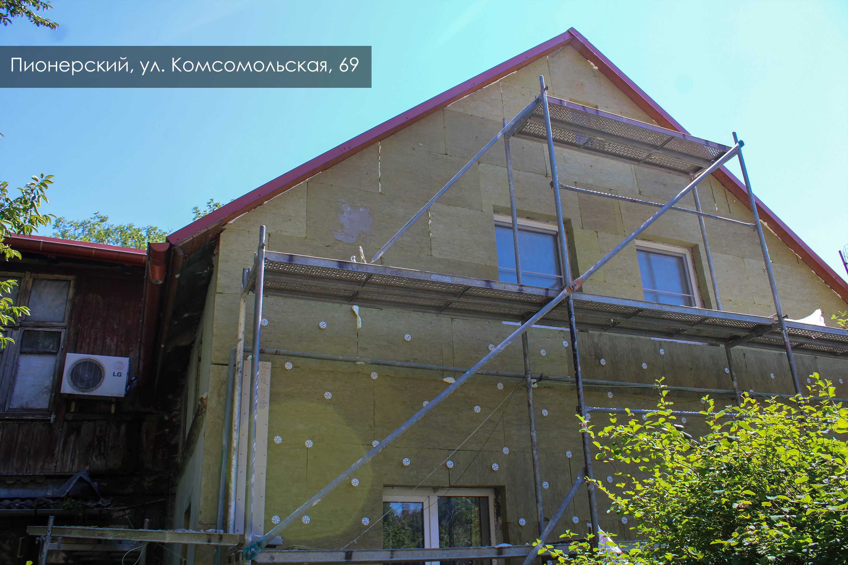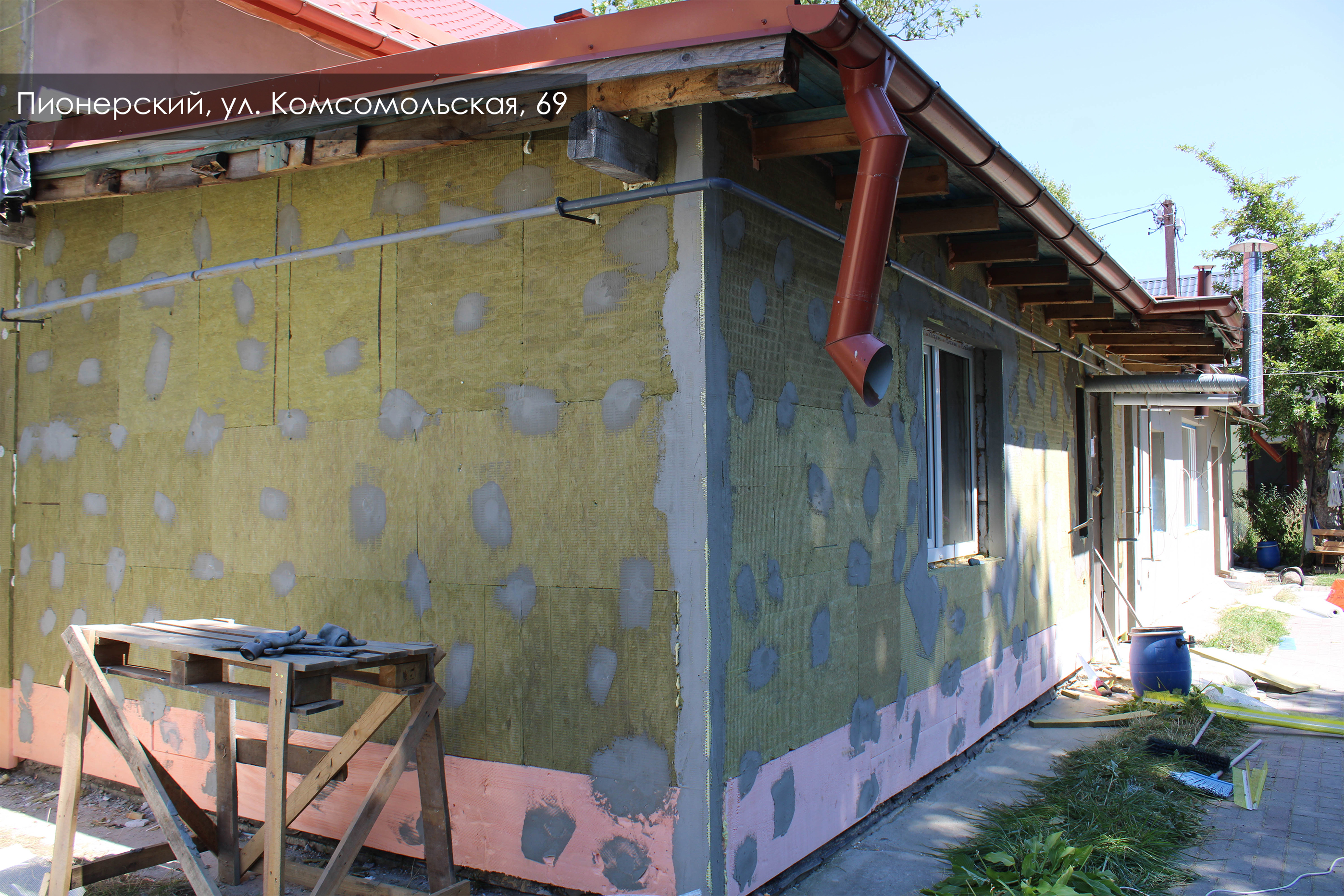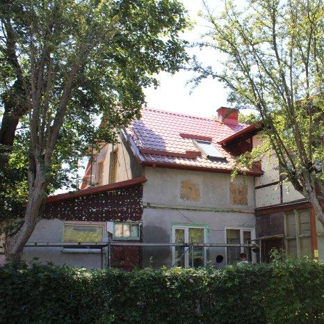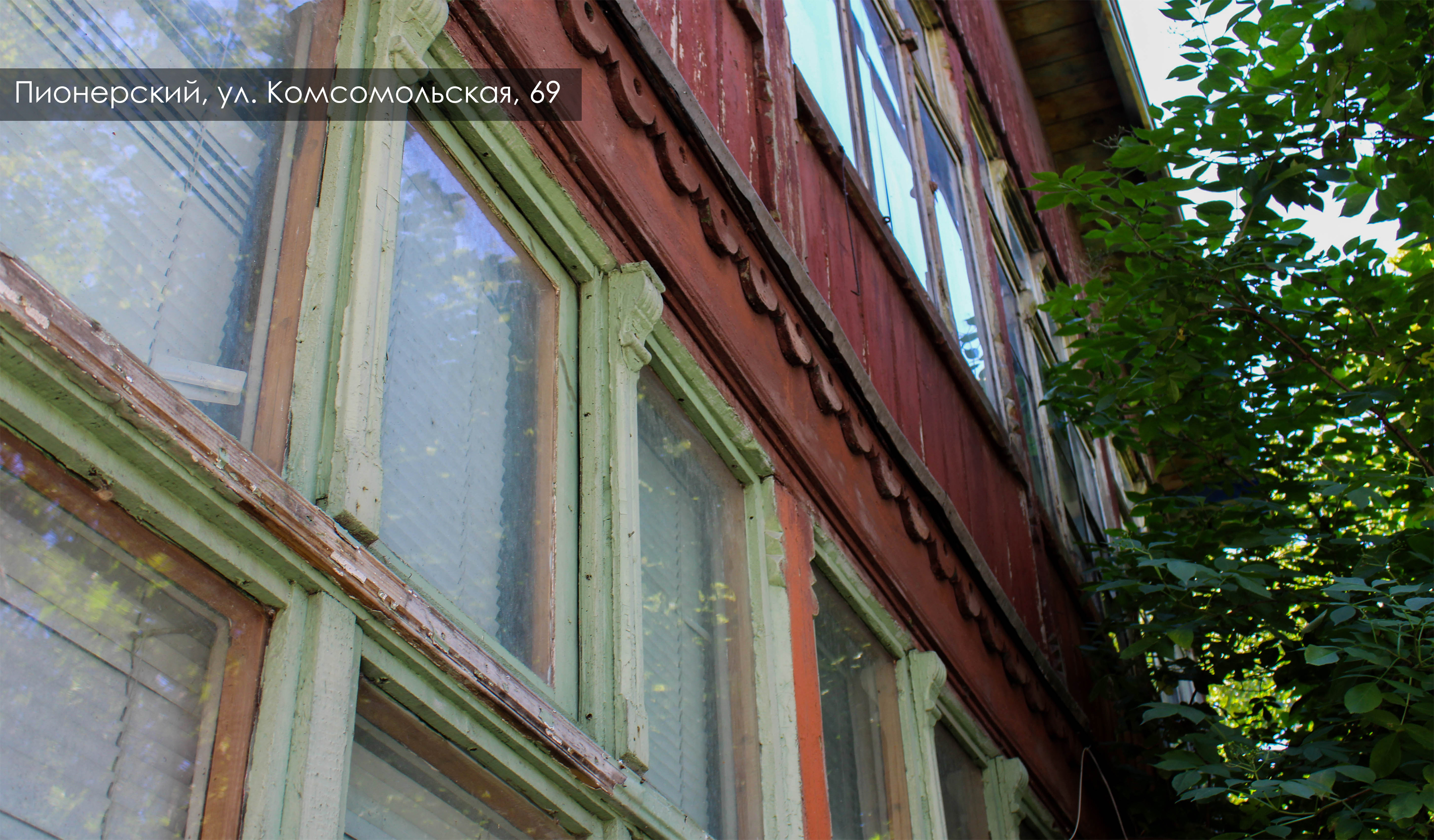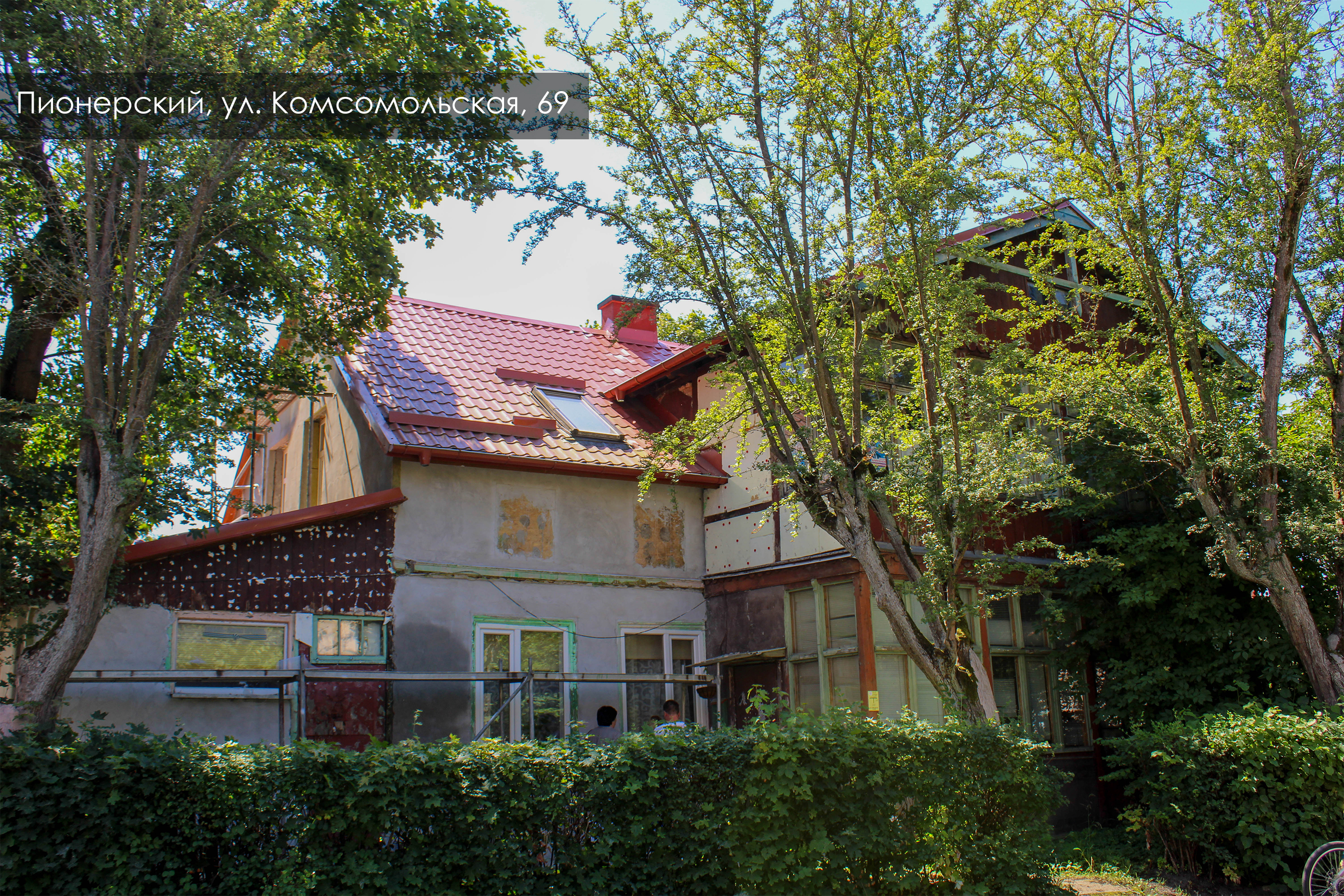 Дом на Комсомольской, 69 в Пионерском, вероятно, изначально служил местом для сезонного отдыха. Сейчас утепляем тонкие стены, толщина которых меньше норматива, штукатурим фасад. Произведём заливку бетоном фундамента и отмостки. При чистке фасада обнаружили заложенные окна, установим на них декоративные ставни. Резные декоративные элементы и подоконники восстановим.