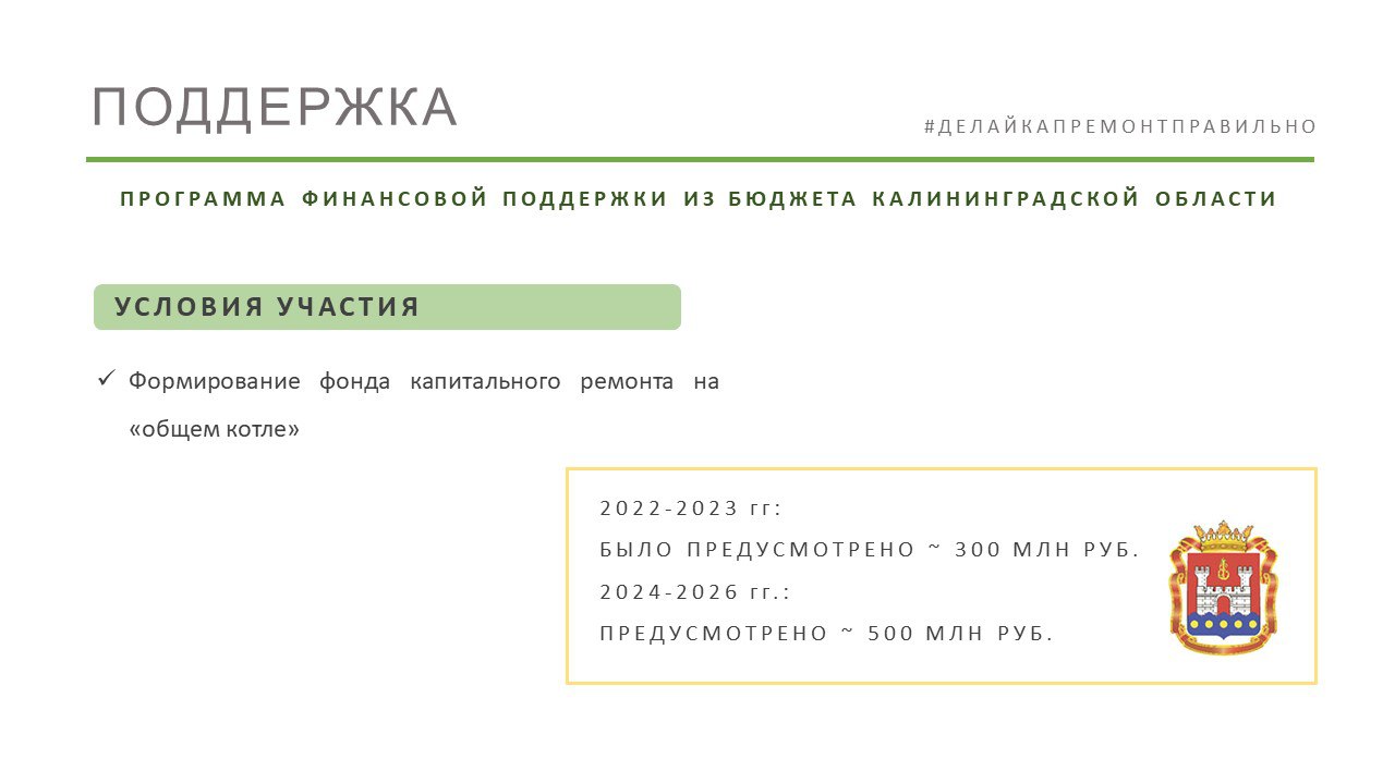 Правительством Калининградской области предусмотрено софинансирование работ по замене лифтового оборудования. Основное условие: формирование фонда капитального ремонта на «общем котле».