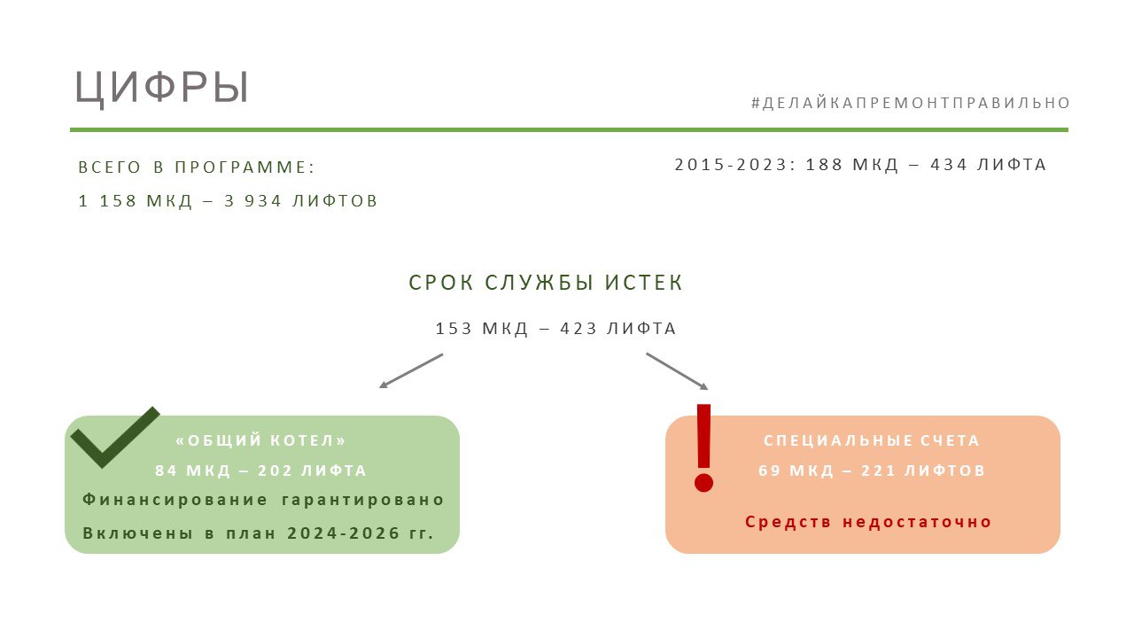 Примерно половина этих лифтов находятся в домах, которые накапливают ежемесячные взносы на счете регионального оператора («общий котел»). Замена лифтов запланирована в 2024-2026 гг.